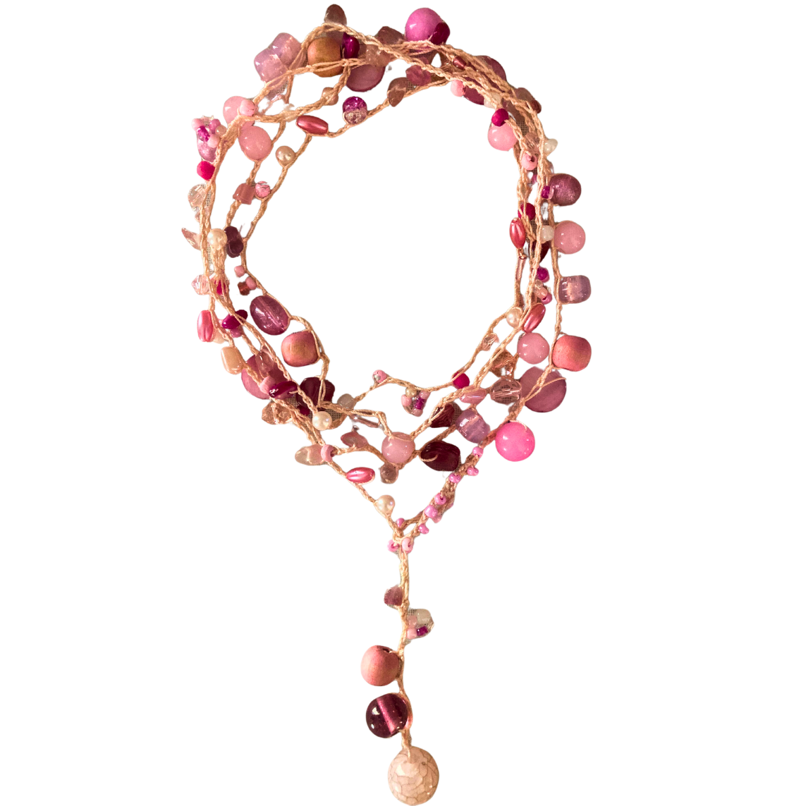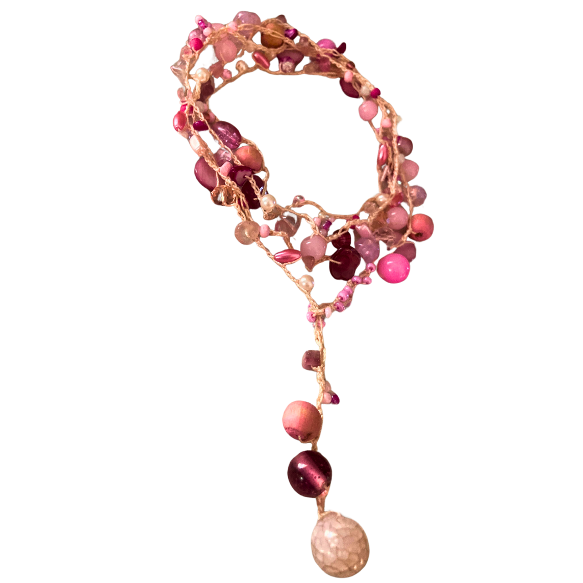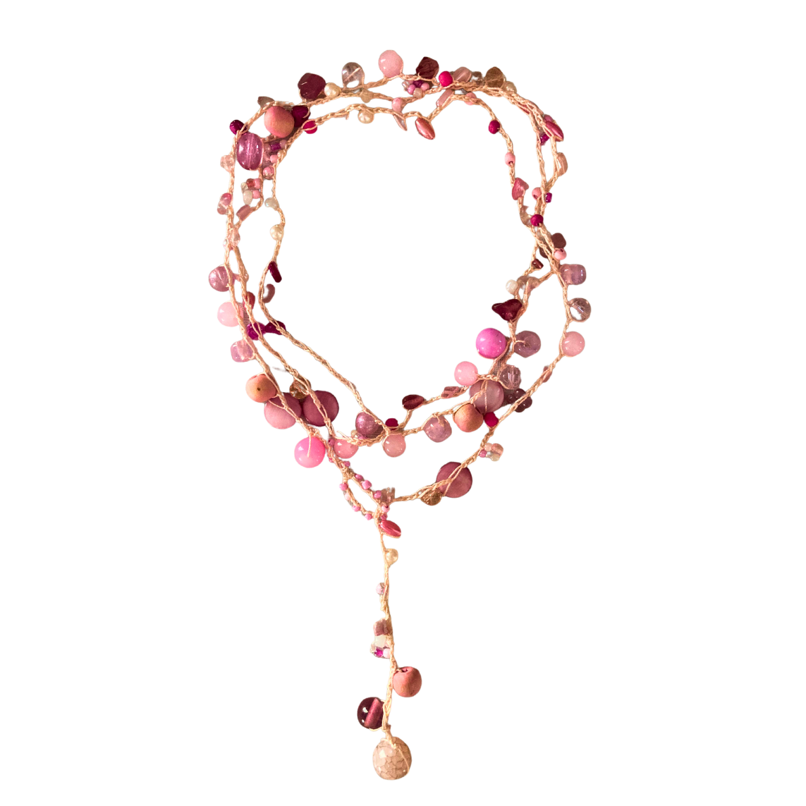 Die Karin hekel lariat is 'n pragtige mengsel van warmte en krag. Met prettige skakerings van pienk weerspieël dit 'n omgee-hart en 'n toegewyde geaardheid. Hierdie stuk verteenwoordig 'n koesterende gees en die vreugde om tyd saam met geliefdes deur te bring terwyl dit 'n speelse aanraking by jou styl voeg.