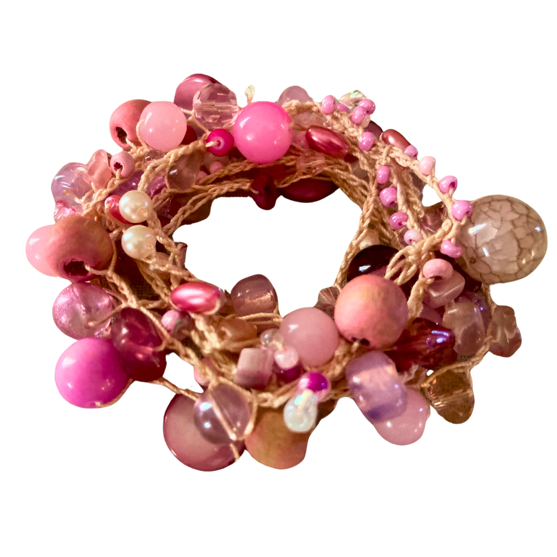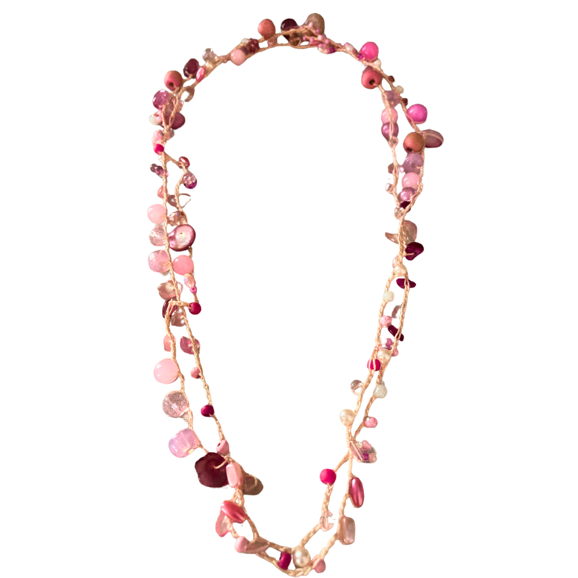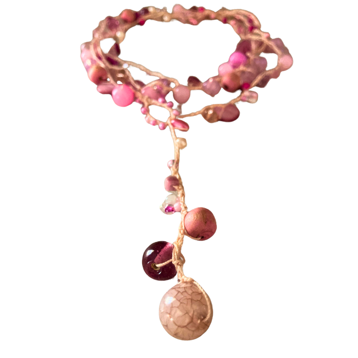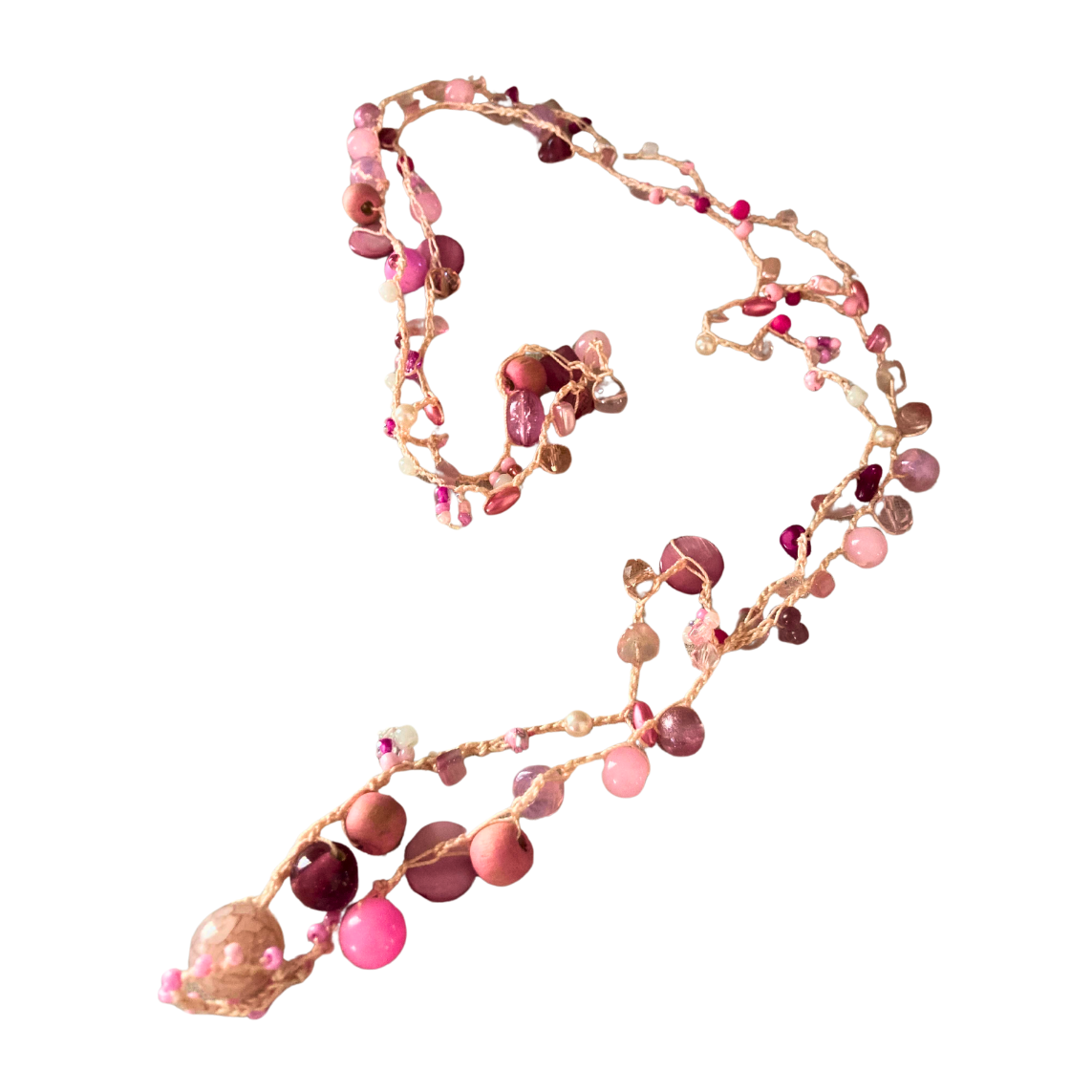 Die Karin hekel lariat is 'n pragtige mengsel van warmte en krag. Met prettige skakerings van pienk weerspieël dit 'n omgee-hart en 'n toegewyde geaardheid. Hierdie stuk verteenwoordig 'n koesterende gees en die vreugde om tyd saam met geliefdes deur te bring terwyl dit 'n speelse aanraking by jou styl voeg.