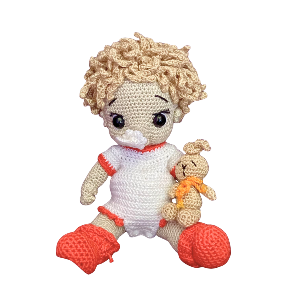 Liesling stands 24 cm tall and 12cm wide, perfectly sized for little hands to cuddle and play with. She is made from high-quality 100% cotton yarn, giving her a soft yet durable finish that’s gentle to the touch. Her movable arms and legs allow for imaginative play and sweet posing, bringing her character to life.