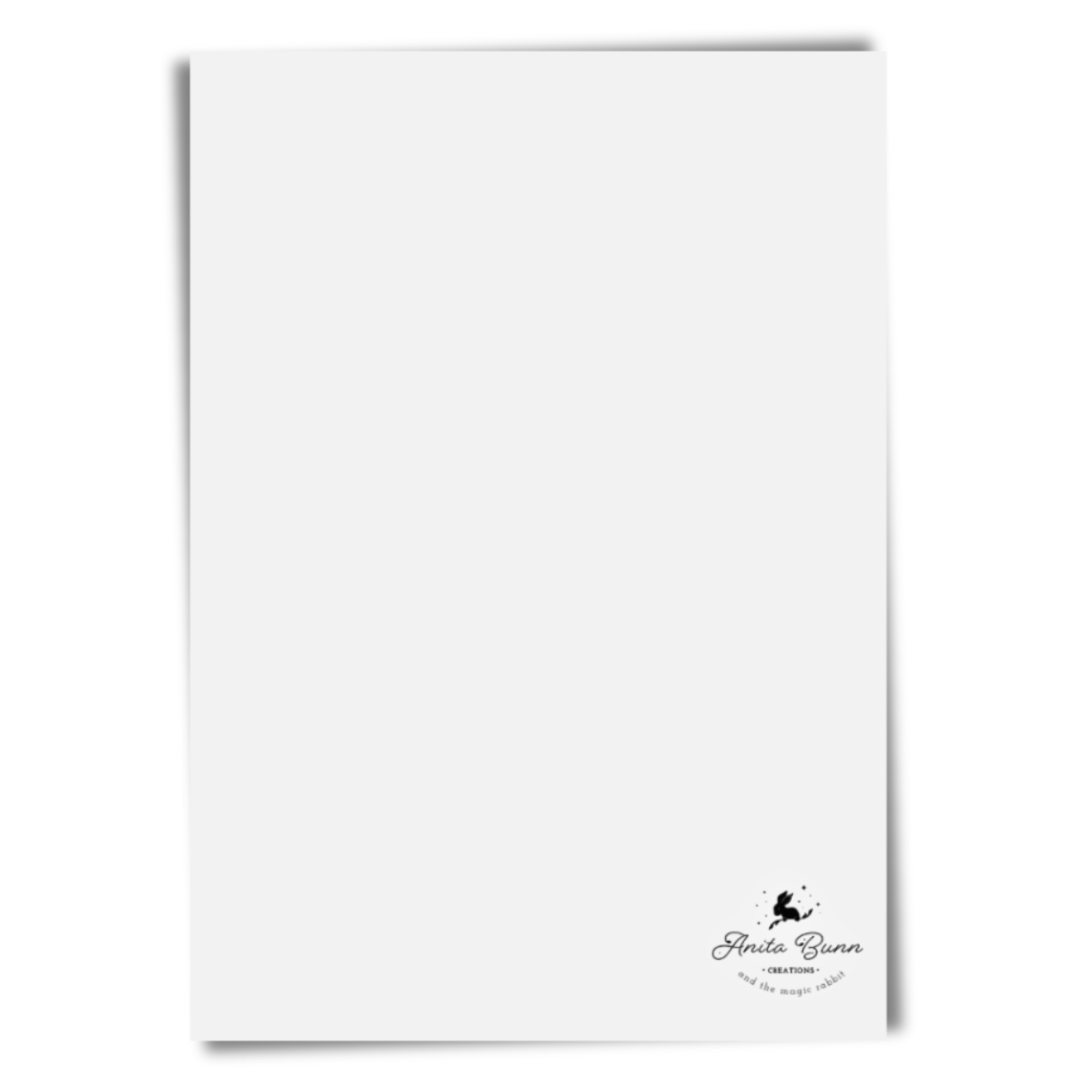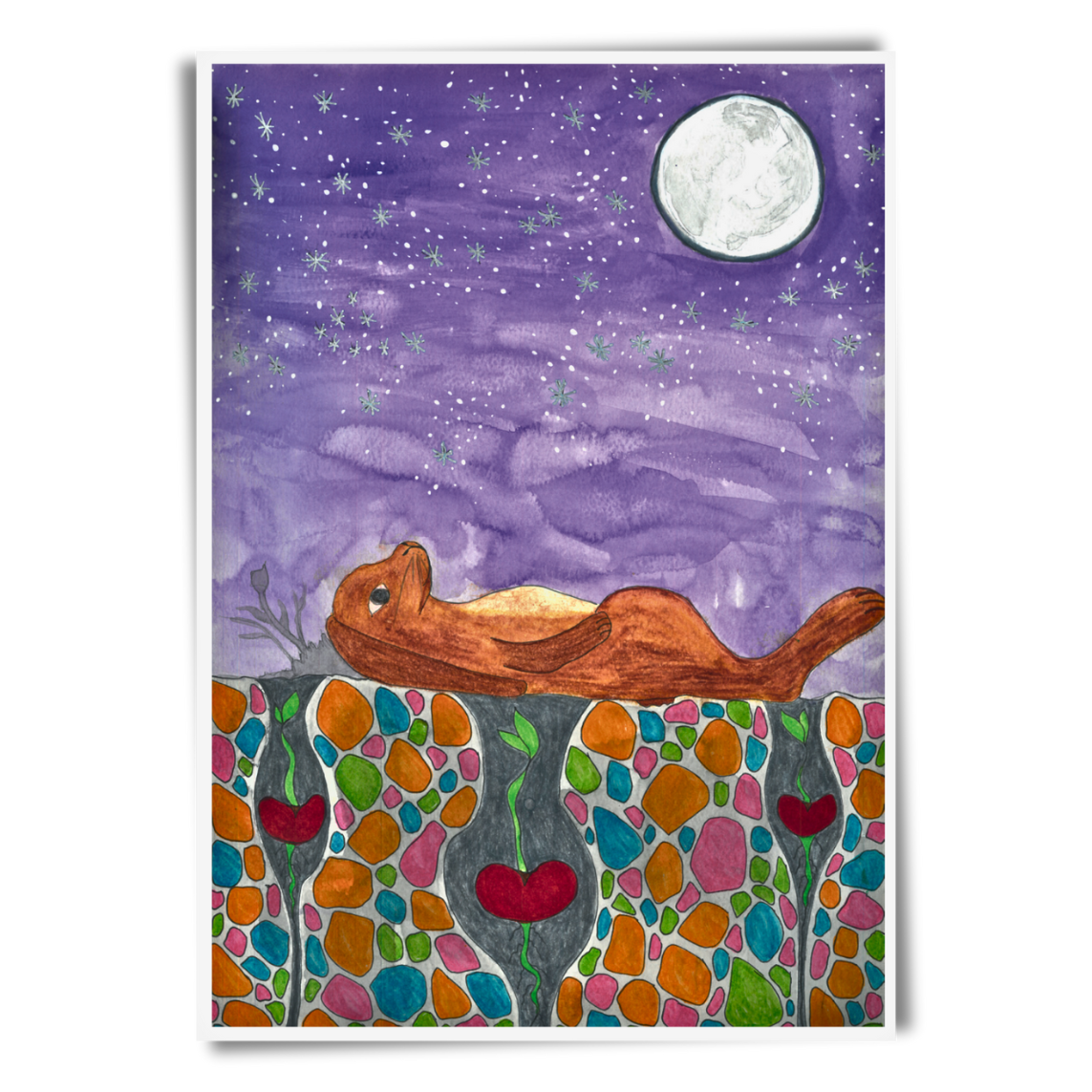 This card by Anita Bunn Creations captures a serene moment of a rabbit resting under a starlit sky. The hand-drawn and coloured illustration features vibrant, heart-shaped plants rooted in a mosaic-like earth, blending beautifully with the purple night sky and glowing full moon. This peaceful design invites reflection and connection with nature.
