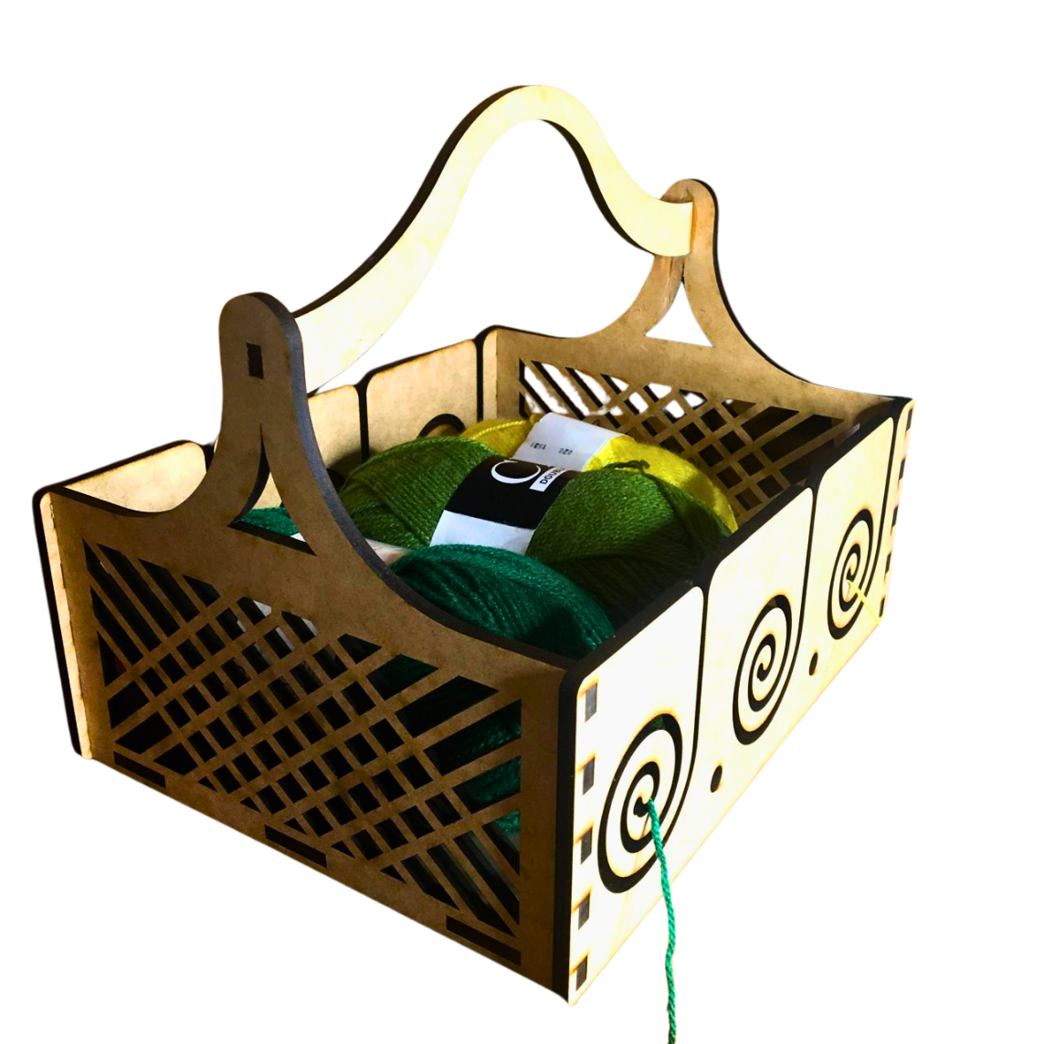 Sit jou wolle in die mandjie, voer die draad deur die gleuf en voilà!
